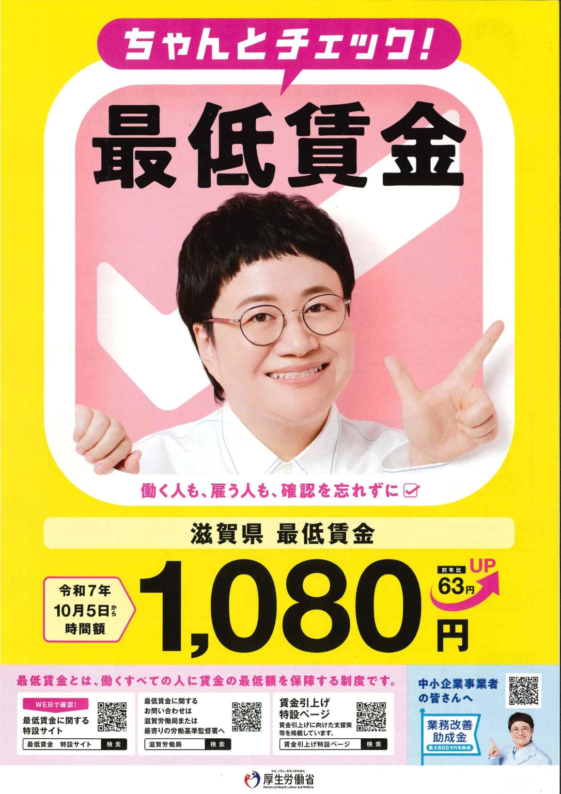 滋賀県の最低賃金は、2025年10月5日(日)から、63円アップの1時間1080円となります。